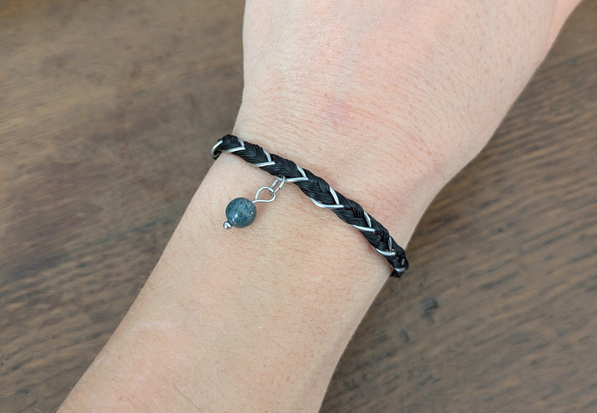 Bracelet tressage épi et acier inoxydable, semi rigide pour s'adapter à toutes les tailles de poignet ! Réalisation sur commande avec les crins de votre cheval ou ceux que j'ai en stock.