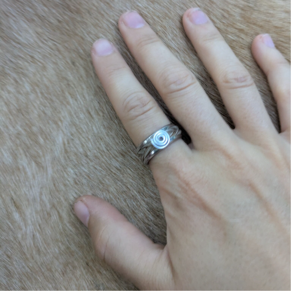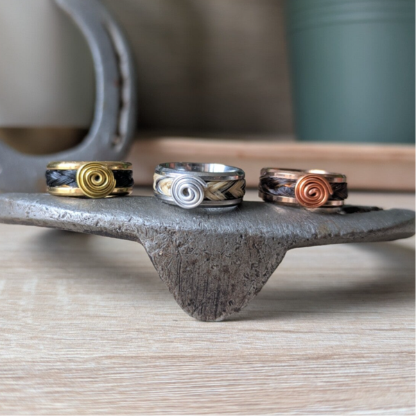 Bague avec une tresse en crins de cheval incrustées dans un anneau en acier inoxydable, avec les crins de votre cheval ou ceux que j'ai en stock. Plusieurs tailles et couleurs disponibles. Tressage épi.